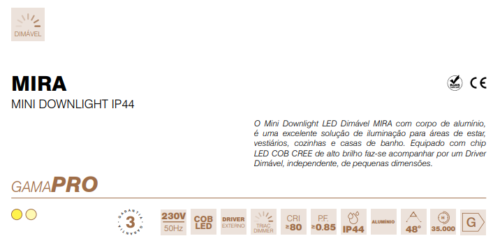 O Mini Downlight LED Dimável MIRA é uma excelente solução de iluminação para áreas de estar, vestiários, cozinhas e banheiros. Equipado com chip LED COB CREE de alto brilho faz-se acompanhar por um Driver Dimável, independente, de pequenas dimensões.