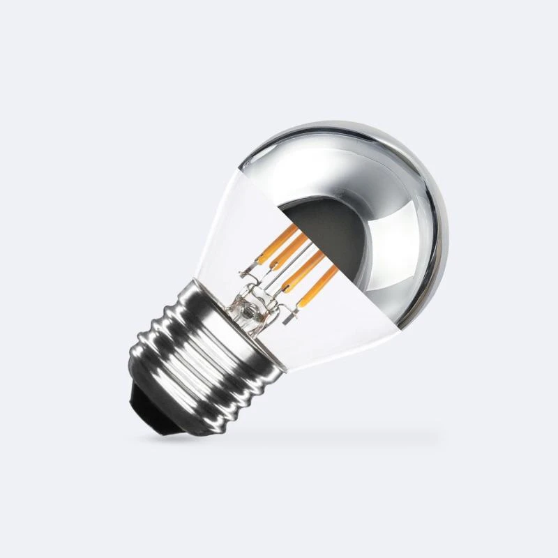 A lâmpada  filamento LED E27 4W 400 lm G45 Chrome Reflect oferece uma alternativa moderna e eficiente para substituir as lâmpadas tradicionais de 60W, mantendo ao mesmo tempo o charme retro tão apreciado. Com a sua ampla distribuição de luz de 300º, esta lâmpada garante uma iluminação uniforme em qualquer ambiente, graças à sua qualidade superior e design em vidro com filamentos.